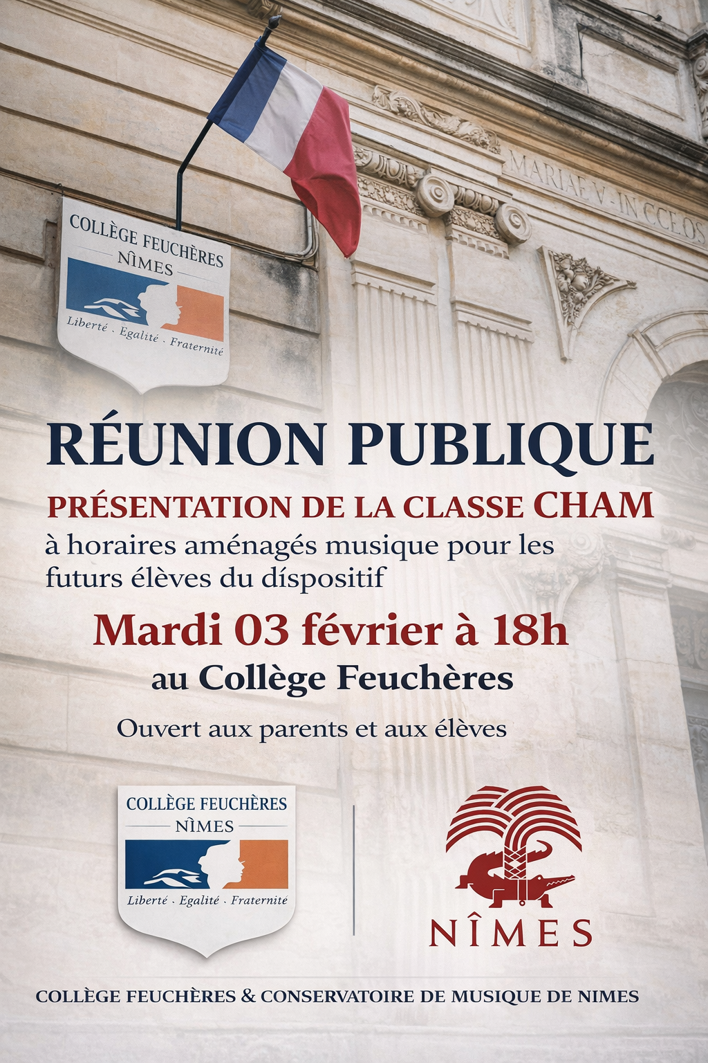 Le collège Feuchères, en partenariat avec le Conservatoire de musique de Nîmes, organise une réunion publique de présentation de la classe CHAM (Classe à Horaires Aménagés Musique).