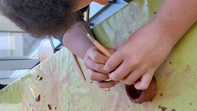 C’est après l’examen attentif des productions gauloises conservées qu’ils ont tout naturellement mis la main à la pâte en se transformant le temps d’un atelier en potier. Les mains pleines d’argile, ils ont modelé leurs pots selon la technique gauloise grâce à des colombins de terre qu’ils ont habilement collés et lissés pour structurer la forme. Puis, c’est le travail de décor qui a pris tout son sens : ciselage, relief, élimination de matière pour créer des pots à la fois utiles… mais aussi esthétiques !