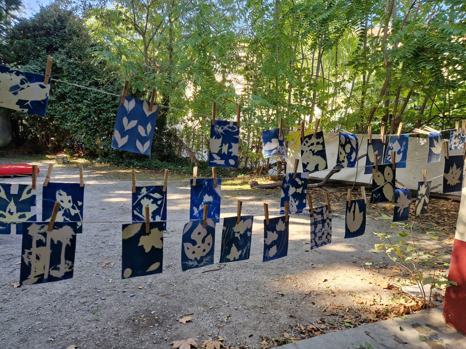Les élèves ont expérimenté cette ancienne technique photographique bleutée, en y intégrant des éléments naturels pour créer de véritables œuvres uniques, mêlant science et poésie.